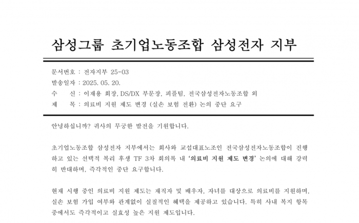 [메가경제=신승민 기자] 삼성그룹 초기업노동조합 삼성전자 지부(이하 초기업노조)는 회사와 전국삼성전자노동조합(이하 전삼노)이 진행 중인 선택적 복리후생 TF의 의료비 지원 제도 변경 논의에 강하게 반대하며, 논의 즉각 중단을 요구했다.