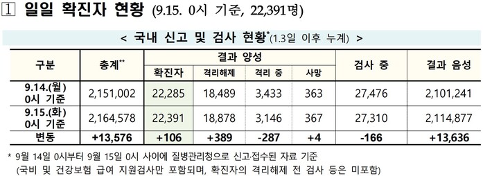 중앙방역대책본부(방대본)는 15일 0시 기준 전날 대비, 코로나19 신규 확진자가 106명 추가 발생했다고 밝혔다. 이날 총 누적 확진자수는 2만2391명을 기록했다.