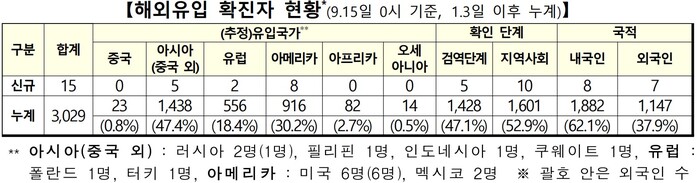 해외유입 사례는 15명으로 총 해외유입 누적 확진자수는 3029명으로 늘었다.