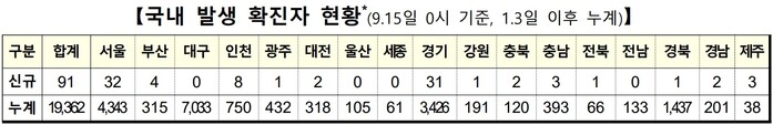 국내 발생 신규 확진자 91명을 지역별로 보면, 서울 32명, 경기 31명, 인천 8명 등 수도권에서 총 71명이 발생했다. 수도권 지역발생 확진자는 지난 12일부터 나흘 연속 86명→60명→81명→71명으로 두 자릿수를 보였다.