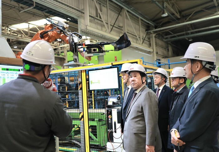 | ▲ 우오현 회장(왼쪽 세 번째)이 지난 16일 경북 구미시 남선알미늄 자동차사업 부문의 자동차 부품 생산공장에서 로봇팔을 활용한 공정을 참관해 운영을 살피고 있다. 이 자리에서 우 회장은 로봇, AI의 적극적인 도입을 통한 시스템 자동화로 미래 성장동력 마련을 주문했다.[사진=SM그룹] |