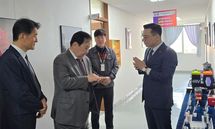 | ▲ 우 회장이 지난 16일 경북 구미시에 있는 SM벡셀 배터리사업 부문의 배터리 생산공장에서 최세환 대표(맨 오른쪽)로부터 건네 받은 방산용 리튬 앰플전지를 살펴보고 있다.[사진=SM그룹] |