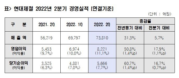 현대제철은 화물연대 파업에 따른 출하 지연으로 지난 1분기보다 판매량이 소폭 줄었으나 철강 원재료 상승에 따른 판매단가 인상으로 매출이 증가했다고 설명했다.