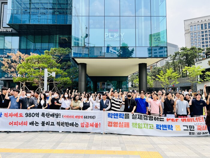 | ▲ 락앤락 노조가 어피너티에쿼티파트너스 본사 앞에서 대주주를 규탄하는 선전전을 펼치고 있다 [사진=락앤락노조] |