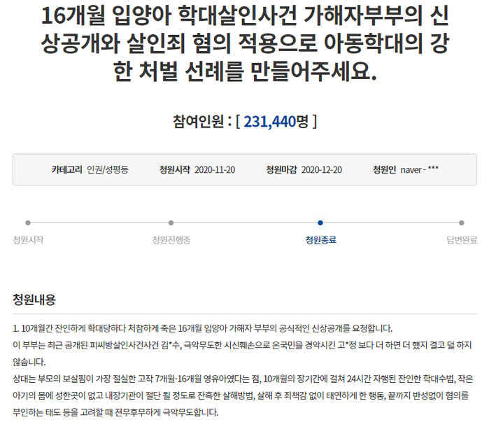 지난해 말 청와대 국민청원에는 “16개월 입양아 학대살인사건 가해자부부의 신상공개와 살인죄 혐의 적용으로 아동학대의 강한 처벌 선례를 만들어주세요”라는 제목의 청원이 올라왔다.