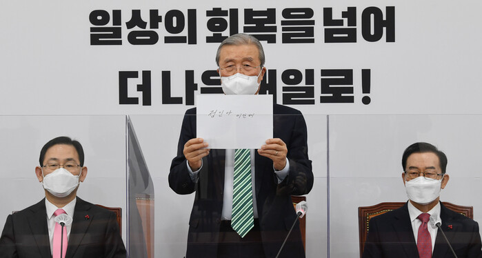 ▲ 국민의힘 김종인 비상대책위원장이 4일 여의도 국회에서 열린 비상대책위원회의에서 "정인아 미안해"라고 적힌 종이를 들어 보여주고 있다. [사진= 연합뉴스] |