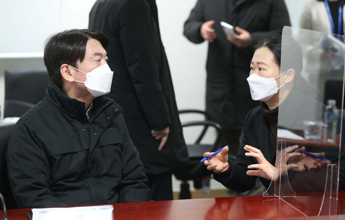 ▲ 국민의당 안철수 대표가 5일 오전 서울 종로구 아동권리보장원에서 열린 아동학대 예방책 마련을 위한 간담회에 참석, 권은희 원내대표와 대화하고 있다. [국회사진기자단=연합뉴스] |