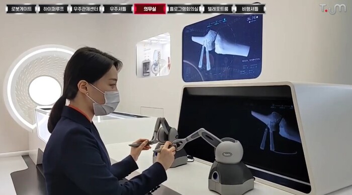 | ▲ 도슨트가 감각전달장치를 통해 조난자를 수술 중인 모습. [SK텔레콤 유튜브 채널 라이브 영상 갈무리] |