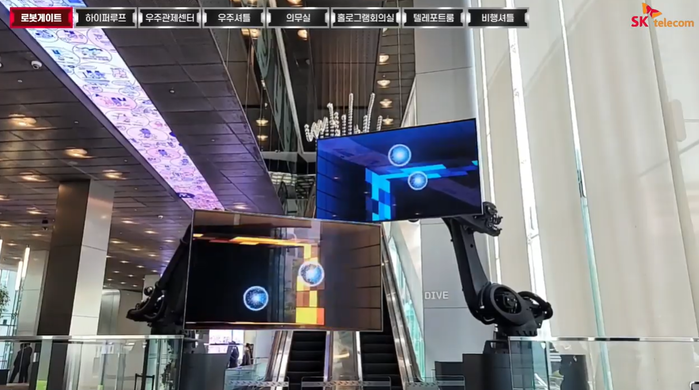 | ▲ 티움 체험관 입구의 로봇팔들이 관객을 맞이하고 있다. [SK텔레콤 유튜브 채널 라이브 영상 갈무리] |