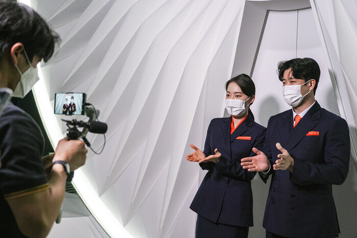 | ▲ 티움 온택트 투어 실시간 촬영 중인 SKT도슨트들의 모습. [사진=SK텔레콤 제공] |