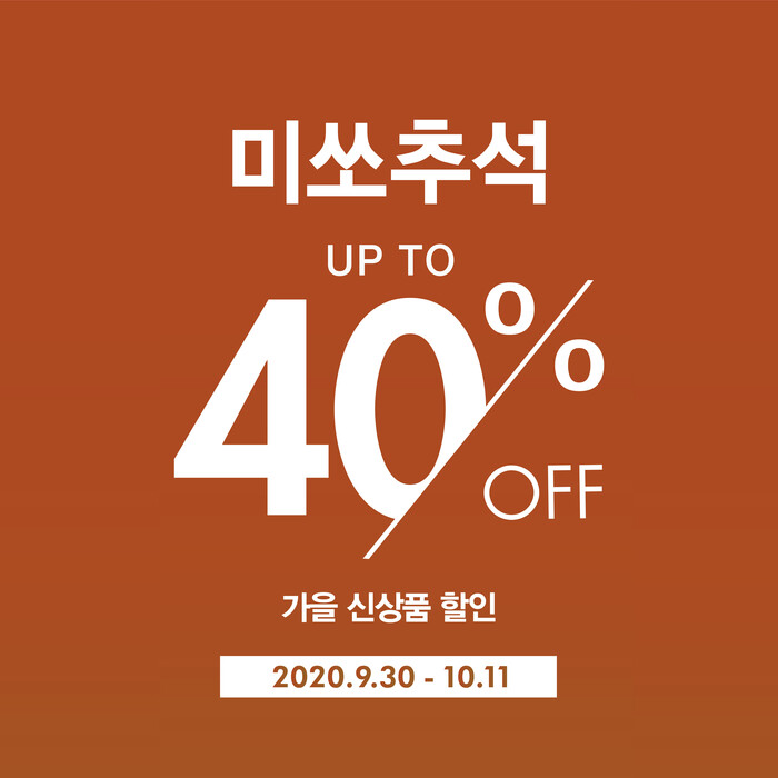 ‘미쏘 추석 미드시즌 세일’이라는 이름으로 열리는 이번 프로모션은 공식 온라인몰과 전국 매장에서 동시에 진행되며 신상품을 포함한 여성 의류 전 품목과 잡화를 최대 40%까지 할인한다.
