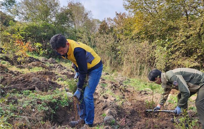 | ▲김윤양 충청본부장이 25일 국립공원공단 직원들과 함께 나무심기 활동을 하고 있다. |