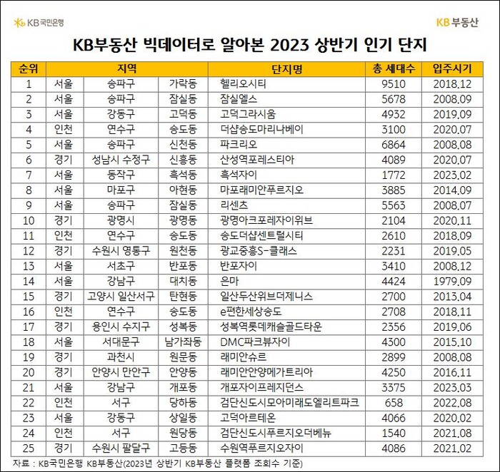 | ▲ KB부동산 빅데이터로 알아본 2023 상반기 최다 검색 단지. [표=KB국민은행] |