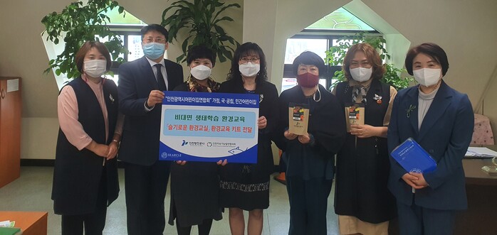 | ▲ 인천항만공사 관계자가 15일 인천광역시어린이집연합회에 '언택트 생태학습 키트'를 전달하고 기념 촬영을 하고 있다. [사진= 인천항만공사] |