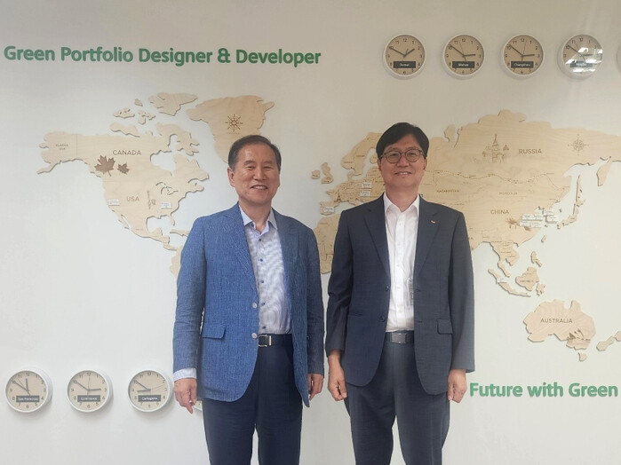 | ▲ 6월 15일 김동섭 한국석유공사 사장(좌)과 이성준 SK이노베이션 환경과학기술원장(우)이 대전 환경과학기술원에서 만남을 갖고 기념사진을 촬영하고 있다. [사진=SK이노베이션] |