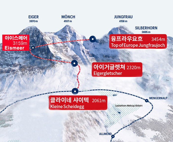 [메가경제=편집국] ] ‘융프라우요흐’는 ‘처녀 어깨’라는 뜻을 가진 이름의 역으로 스위스 알프스의 해발 3454m인 융프라우 봉오리에 1912년 개설되었다.