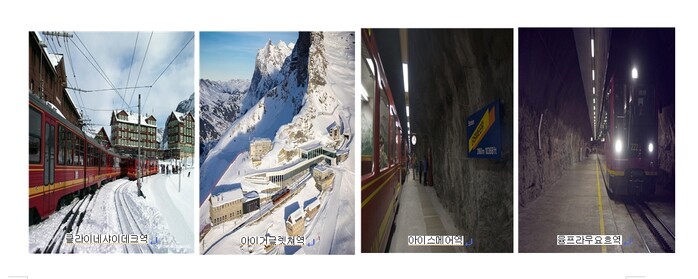 ▲사진 좌측부터 클라이네샤이데크역 ,아이거글렛쳐역, 아이스메어역, 융프라우요흐역 |
