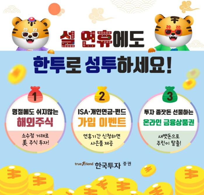 설 연휴를 맞아 한국투자증권이 투자자들의 성공투자를 지원한다. 연휴에도 미니스탁을 통한 소수점거래를 비롯해 해외주식 투자가 가능하고, 금융상품을 살 수 있는 온라인금융상품권을 설 선물이나 세뱃돈으로 활용할 수 있다. 또, ISA·개인연금·펀드에 가입하고 입금하면 상품권 및 경품을 제공하는 이벤트도 진행한다.
