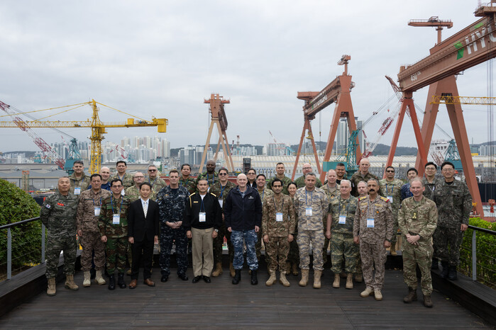 ▲ 25개국에서 온 30명의 주한 무관단 일행이 3월 31일(화) HD현대중공업을 방문해 최고 수준의 함정 건조 역량을 확인했다.[사진=HD현대중공업]