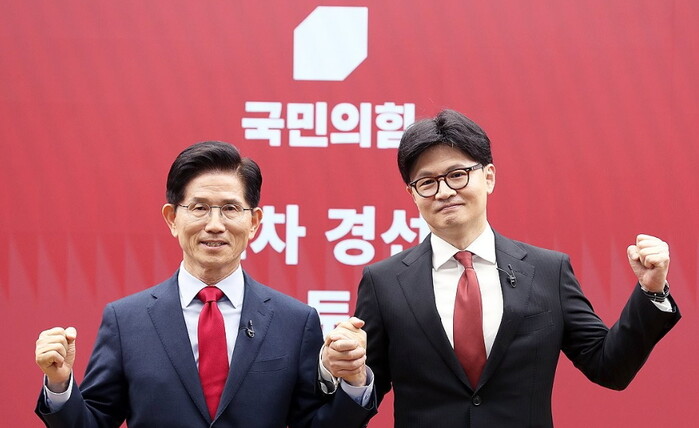 ▲ 김문수 후보(왼쪽)와 한동훈 후보가 국민의힘 대통령 선거 경선 결선에 진출했다. [사진=연합뉴스] |