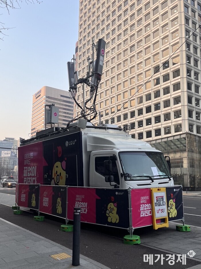 | ▲ 시청 앞 부근에 설치된 LG유플러스의 이동기지국. [사진=메가경제] |