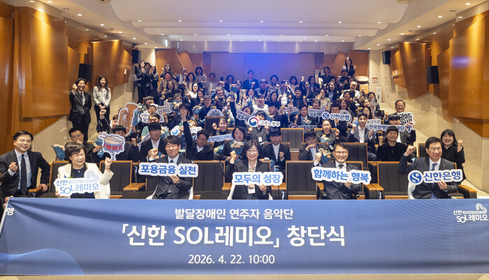 [메가경제=정태현 기자] 신한은행은 서울 강남구 역삼동 신한아트홀에서 발달장애인 연주자로 구성된 음악단 ‘신한 SOL레미오’ 창단식을 개최했다고 22일 밝혔다. 이는 금융권 최초 사례다.