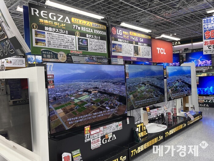| ▲ 일본 교토에 위치한 가전 전문 매장 '요도바시 카메라'에 레그자, LG전자, TCL의 77형 초대형 TV가 나란히 전시돼 있다. [사진=메가경제] |