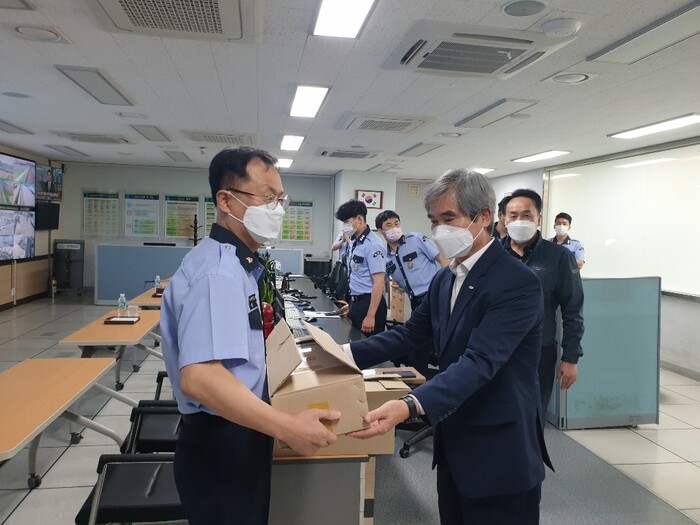 ▲ 부산항보안공사를 방문한 남기찬 부산항만공사 사장(사진 우측)이 직원에게 떡을 전달하고 있다. [사진= 부산항만공사] |