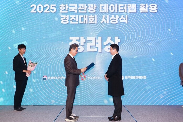 ▲ (사진 왼쪽)한국관광공사 사장 직무대행 서영충, (사진 오른쪽)ENA스위트호텔 서울 총지배인 신용진 10월23일. 주최 문화체육관광부, 한국관광공사2025 한국관광 데이터랩 활용 대회에서 장려상을 수상했다 |