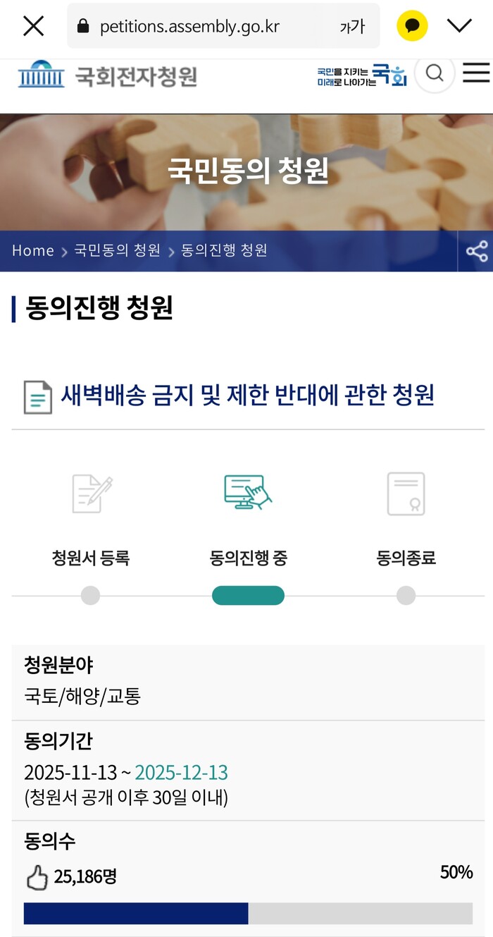 [메가경제=주영래 기자] ‘새벽배송 금지’ 논의를 하루 앞둔 가운데, 국민들의 반대 청원이 급속히 늘고 있다. 27일 기준 새벽배송 금지 반대 국민 청원 참여자는 2만5천명을 넘어섰으며, 청원 게시 2주 만에 국회 상임위원회 회부 요건인 5부 능선을 넘어선 상태다.