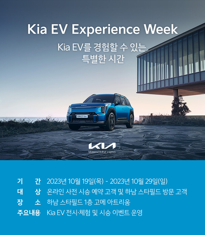 기아는 10월 19~29일 하남 스타필드 고메 아트리움에서 진행 예정인 기아 EV 익스피리언스 위크 개최에 앞서 해당 기간 시승 프로그램에 참여를 희망하는 고객들을 대상으로 온라인 사전 신청을 5일부터 받는다.