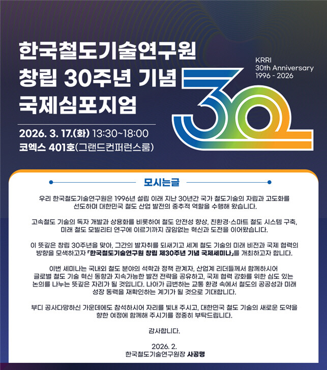 [메가경제=문기환 기자] 한국철도기술연구원(이하 철도연)은 오는 17일 오후 1시 30분, 서울 코엑스 401호 그랜드컨퍼런스룸에서 2026년 창립 제30주년을 맞이해 ‘혁신 기술로 여는 철도, 대중교통의 미래’ 를 주제로 국제세미나를 개최한다.