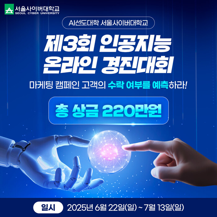 이번 경진대회는 서울사이버대 빅데이터·AI센터가 주관하며, 인공지능학과와 빅데이터·정보보호학과가 협력해 진행한다.