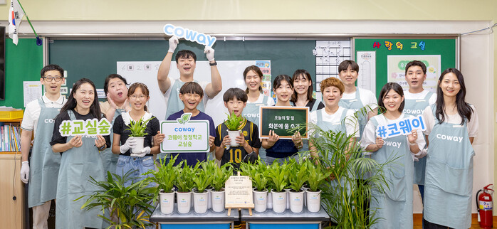 ‘코웨이 청정학교 교실숲 4호’로 선정된 학교는 서울 노원구의 서울당현초등학교다. 코웨이는 임직원 봉사단과 함께 서울당현초등학교의 19개 학급에 공기정화식물 총 494그루를 기증했다.