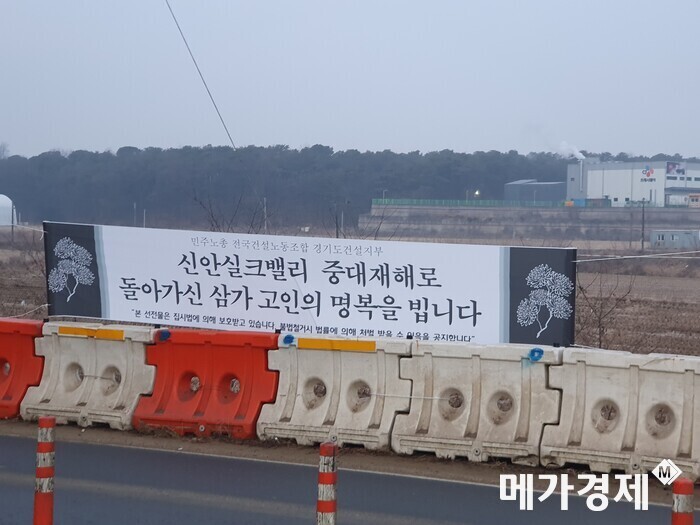 ▲ 지난해 3월 사망한 근로자(개인사업주)의 죽음을 애도하는 현수막. [사진=메가경제] |