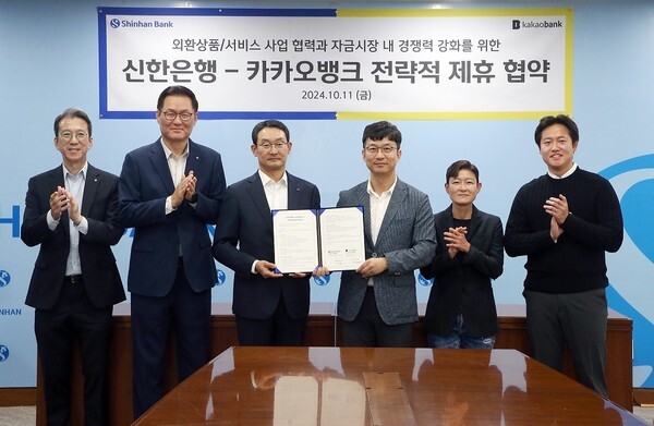 신한은행은 "올 하반기 시행된 '외환시장 구조 개선방안'에 대한 전략적 대응을 위해 카카오뱅크와 다양한 서비스영역에서 상호 협력할 것"이라며 "실시간 환율 제공과 거래체결 시스템, 원·외화 유동성 자금관리를 위한 협업 등도 강화할 예정"이라고 말했다.