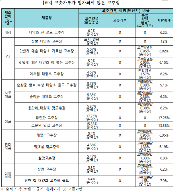 또 고추 양념과 혼합양념 분말로만 제조된 고추장과 마찬가지로 국산 고추 양념을 사용하는 경우를 찾기 힘들고, 샘표의 '참진한 고추장', '소문난 맛집 고추장'과 CJ의 '찹쌀 태양초 고추장'을 제외하면 고춧가루 함량의 합계가 10%를 넘기는 제품이 없는 것으로 나타났다.
