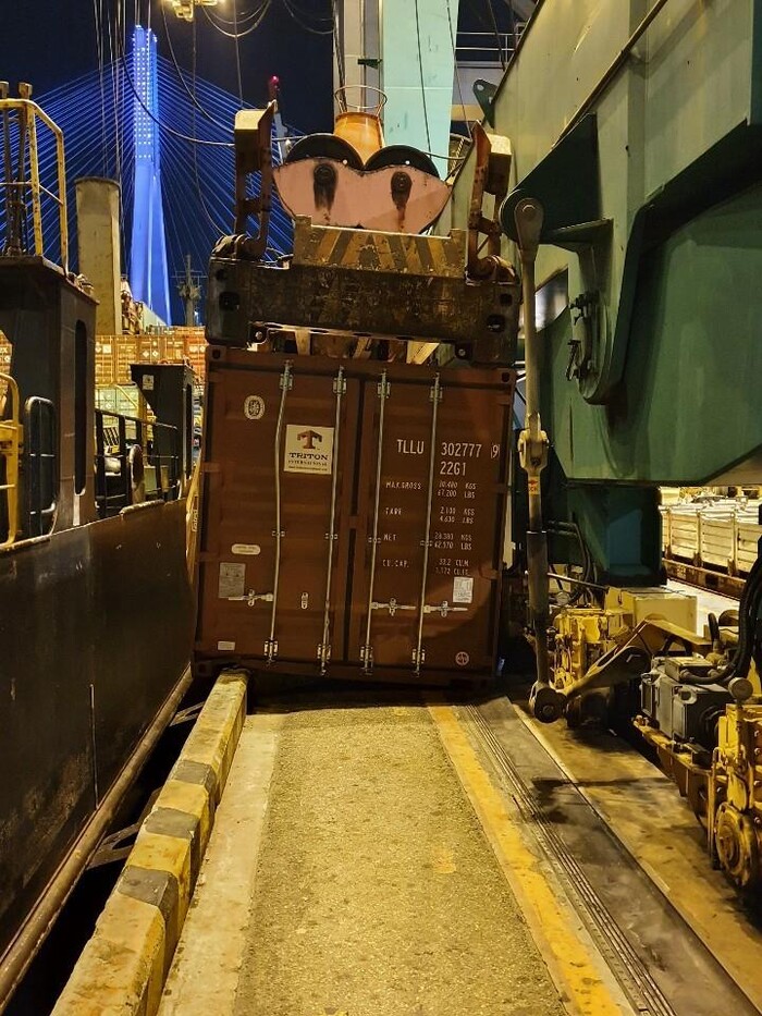 크레인 운전기사가 비상정지 스위치를 눌렀으나 제대로 제동이 되지 않아 컨테이너가 선박과 크레인 사이 바닥으로 떨어졌다.