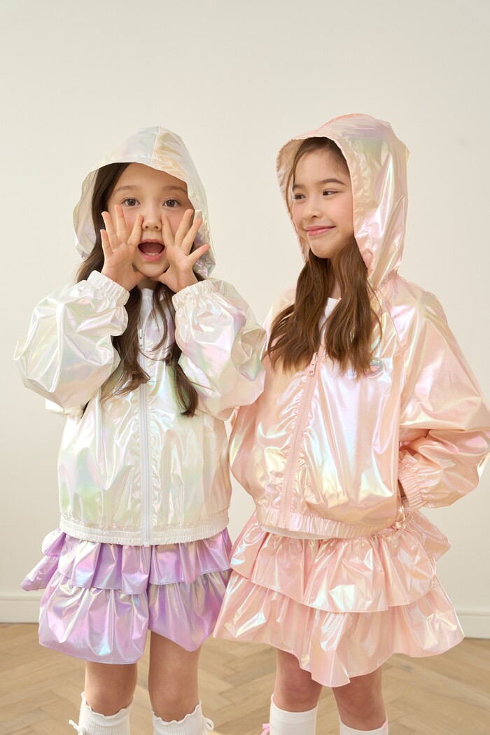 리버서블 글로시 바람막이는 빛에 따라 다양한 색감으로 반짝이는 오로라 소재를 적용한 봄철 아우터로, 양면 디자인을 통해 두 가지 스타일 연출이 가능하다. 투명 하트 쉐이커 디테일을 더해 움직임에 따라 흔들리는 시각적 요소를 강조했으며, 유연한 밴딩 처리로 활동성과 볼륨감을 동시에 구현했다.