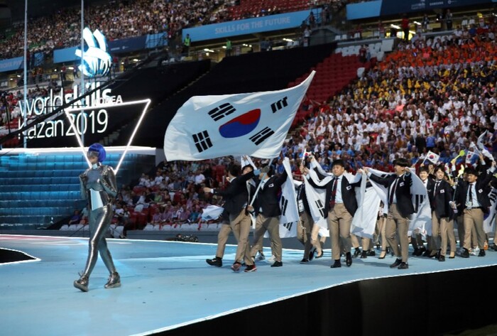 | ▲ 2019년 러시아 카잔 제45회 국제기능올림픽대회 개막식에서 입장하는 한국 선수단 (사진 = 산업인력공단 제공) |