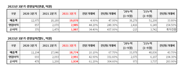 매출액은 전년 동기보다 47% 늘어난 1조 9070억 원으로 집계됐다. 순이익은 1987억 원으로 437% 증가했다.