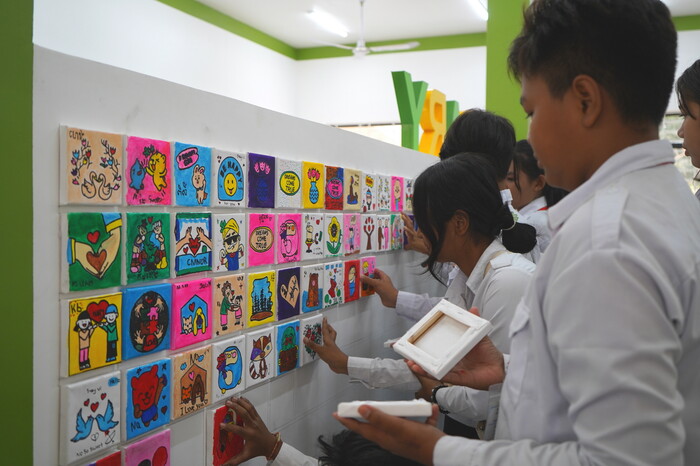 | ▲KB국민은행이 캄보디아 댐낙엠필 중학교에 위치한 ‘KB라이브러리’에 미니 캔버스 액자 700여점을 선물했다. [사진= KB국민은행] |