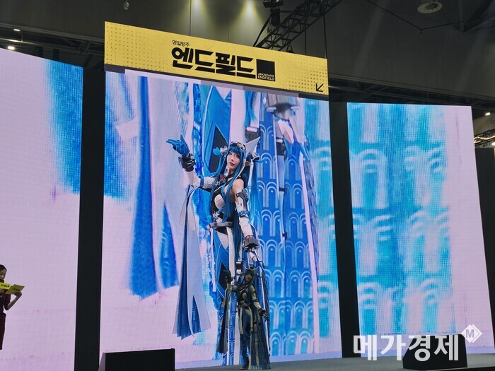 | ▲그리프라인의 명일방주: 엔드필드 전시부스에서 코스프레 무대가 진행되고 있다. [사진=메가경제] |