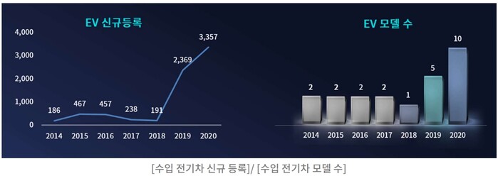 이날 수입차협회가 공개한 자료에 따르면, 지난 2010년 수입차 국내 판매량 중 친환경 차량의 비중은 2.5%에 그쳤지만, 이후 10년이 흐른 2020년 18.1%까지 상승했다.