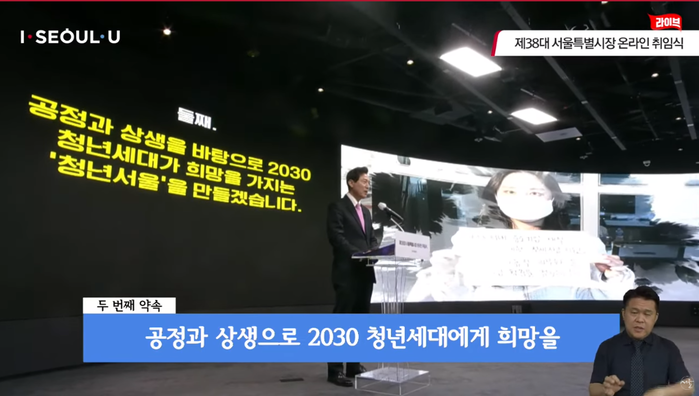 ▲ 오세훈 시장은 22일 취임사에서 "공정과 상생을 바탕으로 2030청년세대가 희망을 가지는 '청년서울'을 만들겠다"는 등 다섯 가지 약속을 발표했다. [출처= 서울시 공식 유튜브 캡처] |