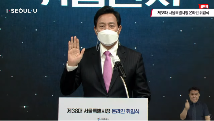 오 시장은 22일 오전 동대문디자인플라자(DDP)의 '서울-온' 스튜디오에서 온라인으로 생중계된 제38대 시장 비대면 취임식에서 이같이 밝혔다.