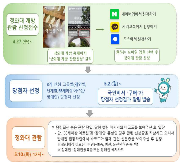 관람을 희망하는 경우, 스마트폰을 통해 청와대 개방 홈페이지에 접속한 후, 네이버앱·카카오톡·토스 3개 중에서 선호하는 온라인플랫폼 앱을 선택해 신청할 수 있다. 스마트폰의 사용이 어려운 분들은 네이버 ‘PC웹사이트’를 통해서도 신청이 가능하다.