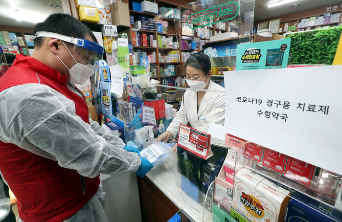 ▲ 12일 오전 인천시 부평구 한 약국에서 열린 코로나19 경구용(먹는) 치료제 투약 예행 연습'에서 부평구보건소 관계자가 치료제를 약국에서 수령해 환자에게 전달하는 연습을 하고 있다. [인천=연합뉴스] |