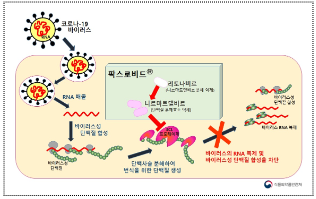 팍스로비드는 단백질 분해효소(3CL 프로테아제)를 차단해 바이러스 복제에 필요한 단백질이 생성되는 것을 막아 바이러스의 증식을 억제하는 의약품이다.