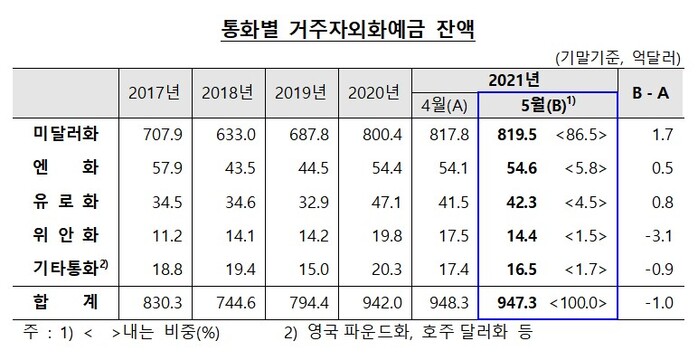 한편 5월말 기준 외국환은행의 전체 거주자외화예금은 947억3000만달러로 전달말에 비해 1억달러 감소했다.